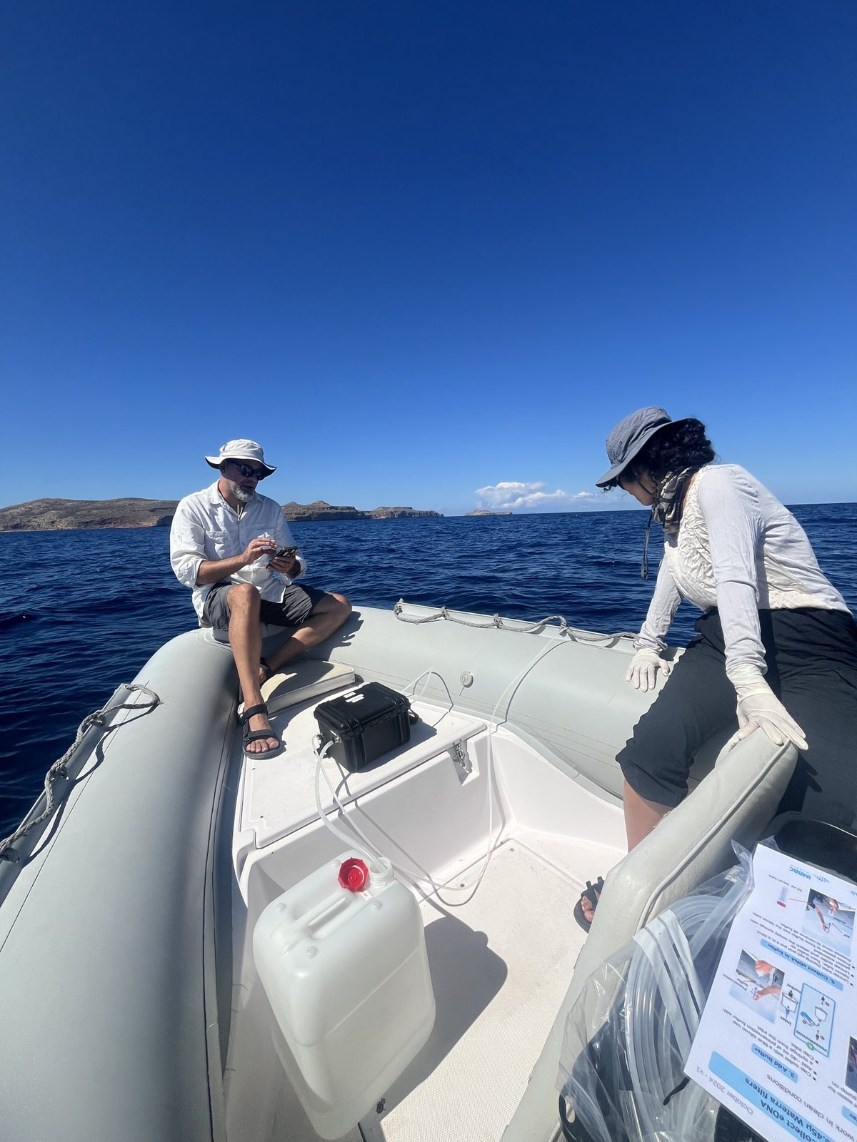 Επιστήμονες και των δύο ερευνητικών ιδρυμάτων της Κρήτης ταξίδεψαν στη νησίδα Άγρια Γραμβούσα προκειμένου να συλλέξουν δείγματα θαλασσινού νερού για αναλύσεις περιβαλλοντικού DNA με στόχο την εφαρμογή πρωτοκόλλων που αναπτύσσονται από το ΕΛΚΕΘΕ για την ανίχνευση θαλάσσιων θηλαστικών και ερπετών.