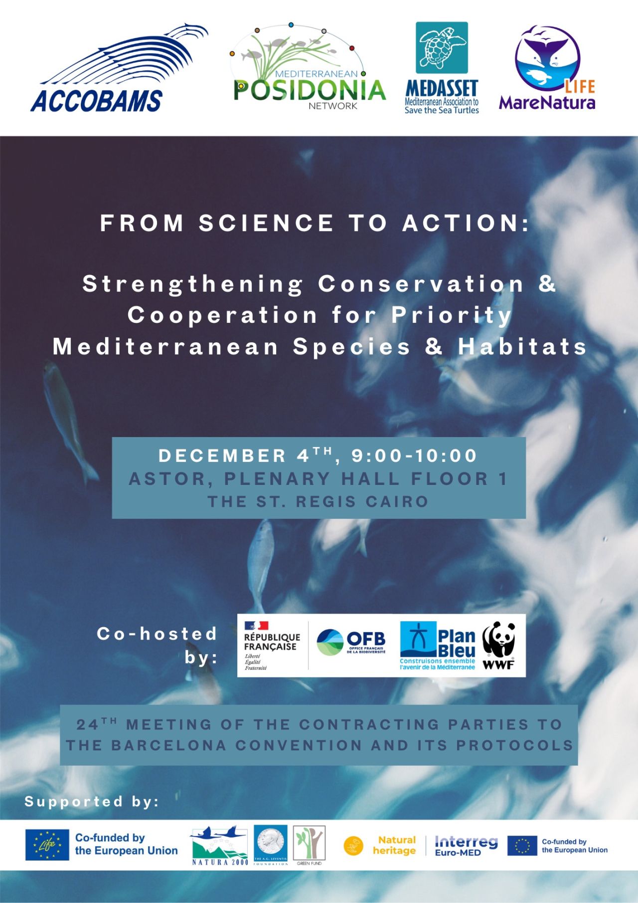 Το έργο, με πρωτοβουλία της MEDASSET και τη συνεργασία της ACCOBAMS, του Γαλλικού Οργανισμού Βιοποικιλότητας (OFB) και του Μεσογειακού Δικτύου Ποσειδωνίας, συνδιοργανώνει παράλληλη εκδήλωση με τίτλο «Από την Επιστήμη στη Δράση: Ενίσχυση της Διατήρησης και της Συνεργασίας για τα Μεσογειακά Είδη και Οικοτόπους Προτεραιότητας», την Πέμπτη 4/12/2025, από τις 9 έως τις 10 το πρωί, στην αίθουσα ASTOR PLENARY HALL 1, του ξενοδοχείου ST. REGIS στο Κάιρο.